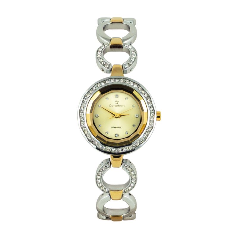 Стилен дамски часовник Cortebert с красив дизайн. Корпусът и верижката са изработени от неръждаема стомана. Дисплеят е аналогов в златист цвят с декорация от нежни кристали Swarovski. Безелът и част от верижката са украсени с цирконии. Стъклото е минерал-кристал. Диаметър на корпуса 28 мм. Часовникът се задвижва от кварцов механизъм. Водоустойчивост 3 ATM - допускат се леки пръски, не се препоръчва обилно мокрене.
