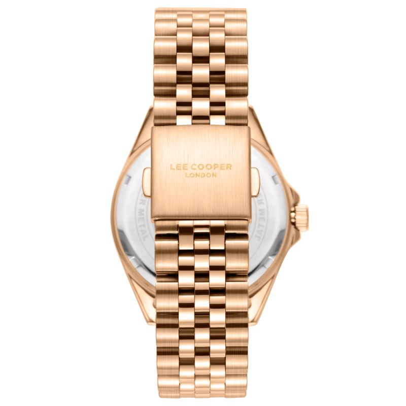 Мъжки часовник Lee Cooper със спортно-елегантна визия. Аналогов дисплей с показател за дата. Луминесцентно покритие върху стрелките и индексите. Стъкло минерал-кристал. Корпус от супер метал - специална сплав, създадена от марката. Верижка от неръждаема стомана в цвят розово злато. Задвижва се от кварцов механизъм. Водоустойчивост 5 ATM - допускат се леки пръски и взимане на душ, не се препоръчва обилно мокрене.