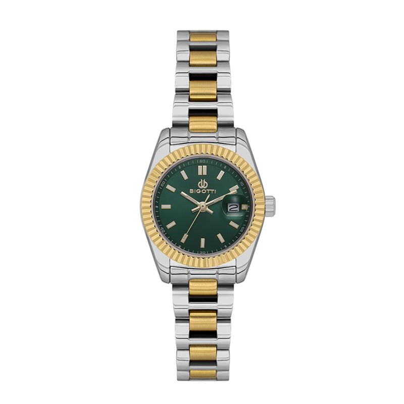 Дамски часовник Bigotti с класически дизайн от колекцията Quotidiana. Моделът е с кропус от месинг и верижка от неръждаема стомана. Аналогов дисплей в тъмнозелен с показател за дата. Луминисцентно покритие върху стрелките и индексите. Стъкло минерал-кристал. Диаметър на корпуса 27 мм. Часовникът се задвижва от кварцов механизъм. Водоустойчивост 3 ATM - допускат се леки пръски, не се препоръчва обилно мокрене.