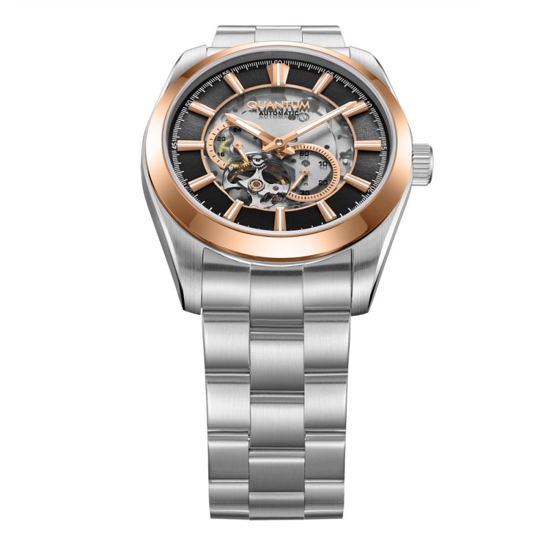 Мъжки часовник Quantum със спортно-елегантен дизайн от колекцията Q-Master. Аналогов дисплей с полускелетонизиран дизайн с видим баланс, 24-часов формат и отделен секундарник. Стъкло сапфир-кристал. Корпус и верижка от неръждаема стомана. Диаметър на корпуса 41 мм. Часовникът се задвижва от автоматичен механизъм с калибър 82S7. Водоустойчивост 10 ATM - позволява мокрене, къпане и плуване във водни басейни.