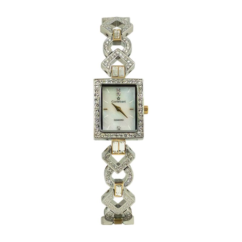 Впечатляващ дамски часовник Cortebert със стилен и модерен дизайн. Моделът е с декорация от два диаманта на циферблата на 12 и 6 часа. Верижката и безела са украсени с нежни  цирконии. Стъклото е минерал-кристал. Корпусът и верижката са изработени от неръждаема стомана. Часовникът се задвижва се от кварцов механизъм. Водоустойчивост 3 ATM - допускат се леки пръски, не се препоръчва обилно мокрене.