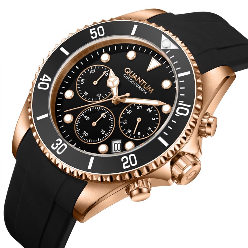 Страхотен модел мъжки часовник Quantum със спортно-ежедневен дизайн. Черен дисплей хронограф с детайли в цвят розово злато. Луминесцентно покритие върху стрелките и индексите. Стъкло минерал-кристал. Корпус изработен от неръждаема стомана. Силиконова каишка в черен цвят. Диаметър на корпуса 44 мм. Часовникът се задвижва от кварцов механизъм с калибър VR32. Водоустойчивост 10 ATM - позволява мокрене, къпане и плуване във водни басейни.