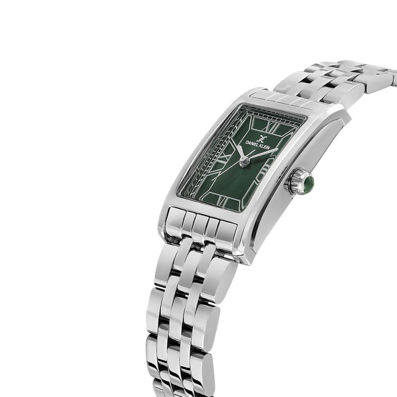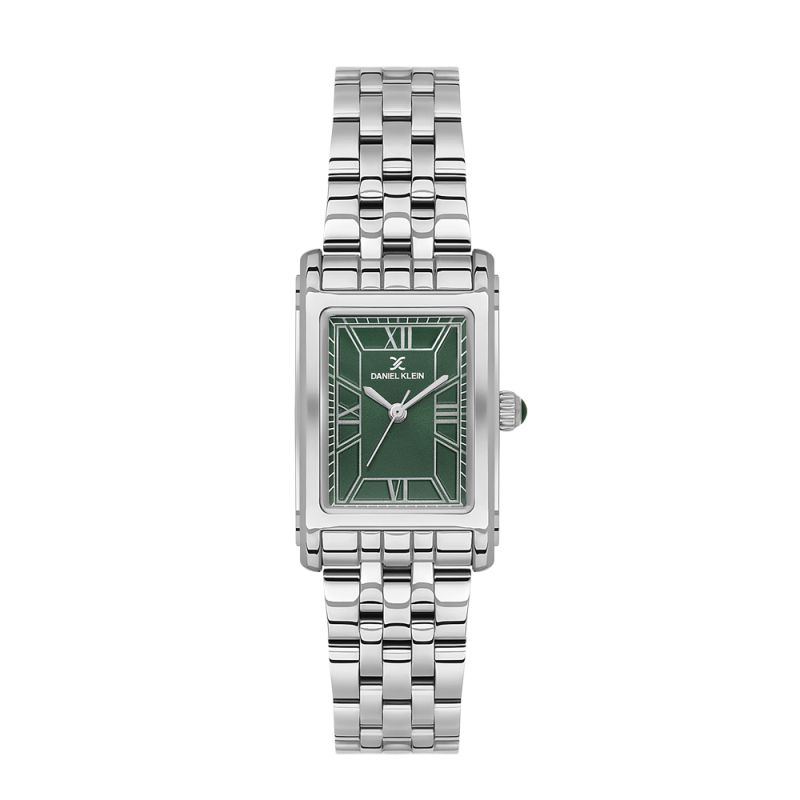 Дамски часовник Daniel Klein със стилен дизайн от колекцията Premium. Моделът е с метален корпус и верижка от неръждаема стомана. Стъклото е минерал-кристал. Дисплеят е аналогов в зелен цвят със сребристи акценти. Задвижва се от кварцов механизъм VJ21C1. Водоустойчивост 3 ATM - допускат се леки пръски, не се препоръчва обилно мокрене.