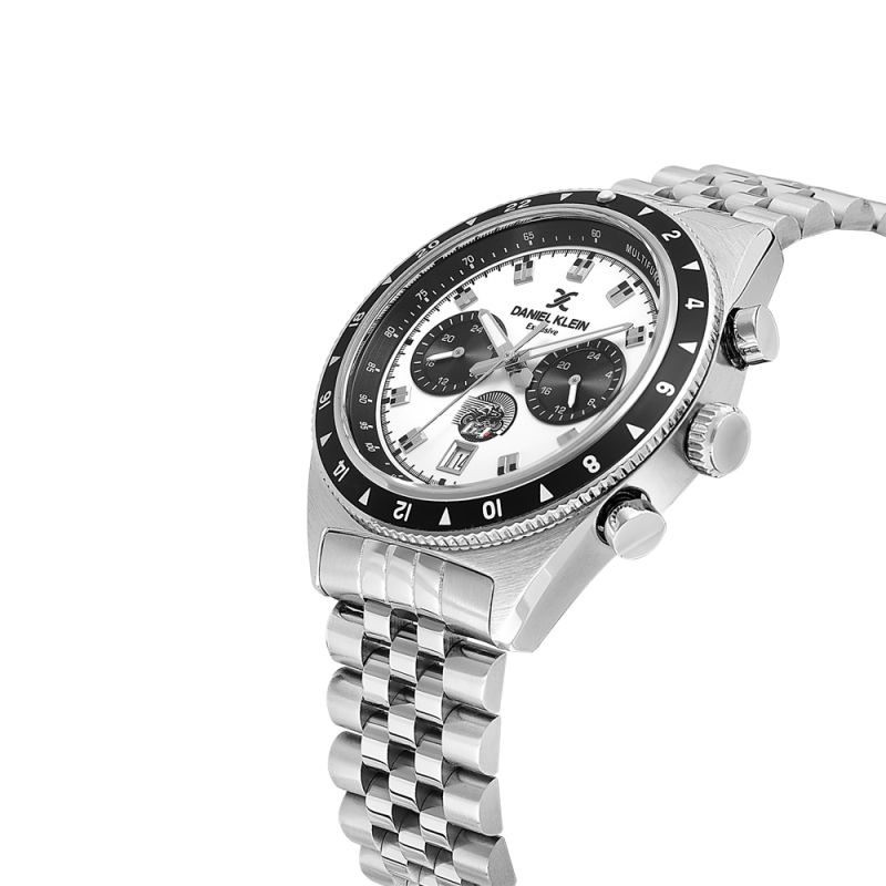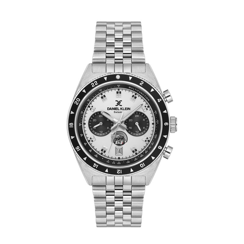 Спортно-елегантен мъжки часовник Daniel Klein от колекцията Exclusive. Мултифункционален дисплей с показатели за дата и двойно време. Метален корпус в комбинация с верижка от неръждаема стомана. Стъкло минерал-кристал. Диаметър на корпуса 43 мм. Часовникът се задвижва от кварцов механизъм VD31B12. Водоустойчивост 5 ATM - допускат се леки пръски и взимане на душ, не се препоръчва обилно мокрене.