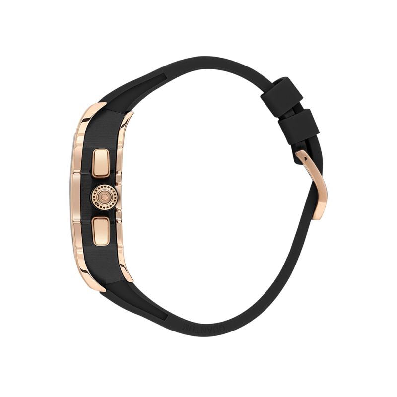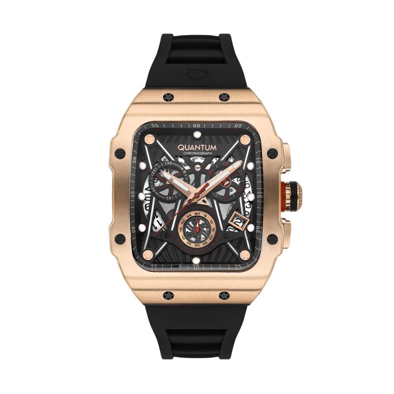Впечатляващ модел мъжки часовник Quantum от колекцията Hunter. Дисплей хронограф с луминесцентно покритие върху стрелките и индексите. Стъкло минерал-кристал. Корпус от неръждаема стомана в комбинация със силиконова каишка. Задвижва се от кварцов механизъм с калибър VR34. Водоустойчивост 10 ATM - позволява мокрене, къпане и плуване във водни басейни.