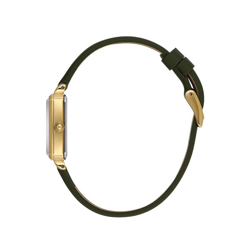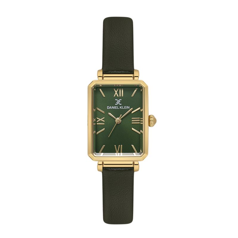Класически модел дамски часовник Daniel Klein с елегантен дизайн от колекцията Premium. Метален корпус в комбинация с каишка от естествена кожа. Стъкло минерал-кристал. Аналогов дисплей в зелен цвят със златисти детайли. Задвижва се от кварцов механизъм VJ21C1. Водоустойчивост 3 ATM - допускат се леки пръски, не се препоръчва обилно мокрене.