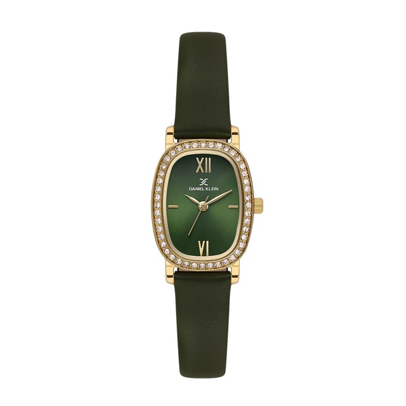 Красив дамски часовник Daniel Klein със стилен дизайн от колекцията Premium. Аналогов дисплей в зелен цвят със златисти акценти. Безел декориран с бляскави кристали. Метален корпус в комбинация с каишка от естествена кожа. Стъкло минерал-кристал. Задвижва се от кварцов механизъм VJ21C1. Водоустойчивост 3 ATM - допускат се леки пръски, не се препоръчва обилно мокрене.
