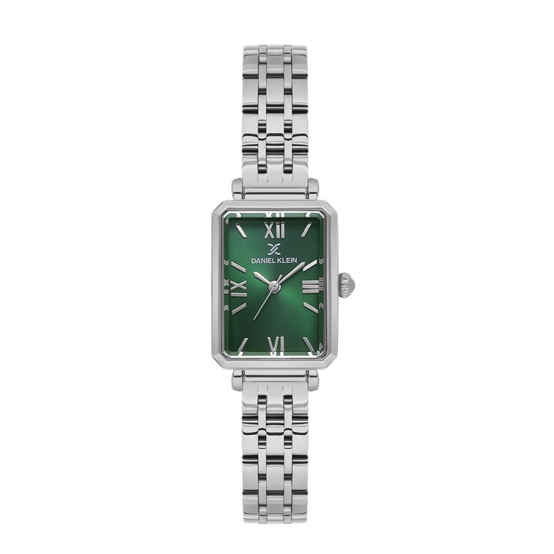 Класически модел дамски часовник Daniel Klein с елегантен дизайн от колекцията Premium. Метален корпус в комбинация с верижка от неръждаема стомана. Стъкло минерал-кристал. Аналогов дисплей в тъмнозелен цвят със сребристи детайли. Часовникът се задвижва от кварцов механизъм VJ21C1. Водоустойчивост 3 ATM - допускат се леки пръски, не се препоръчва обилно мокрене.