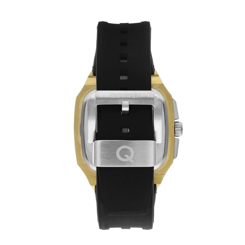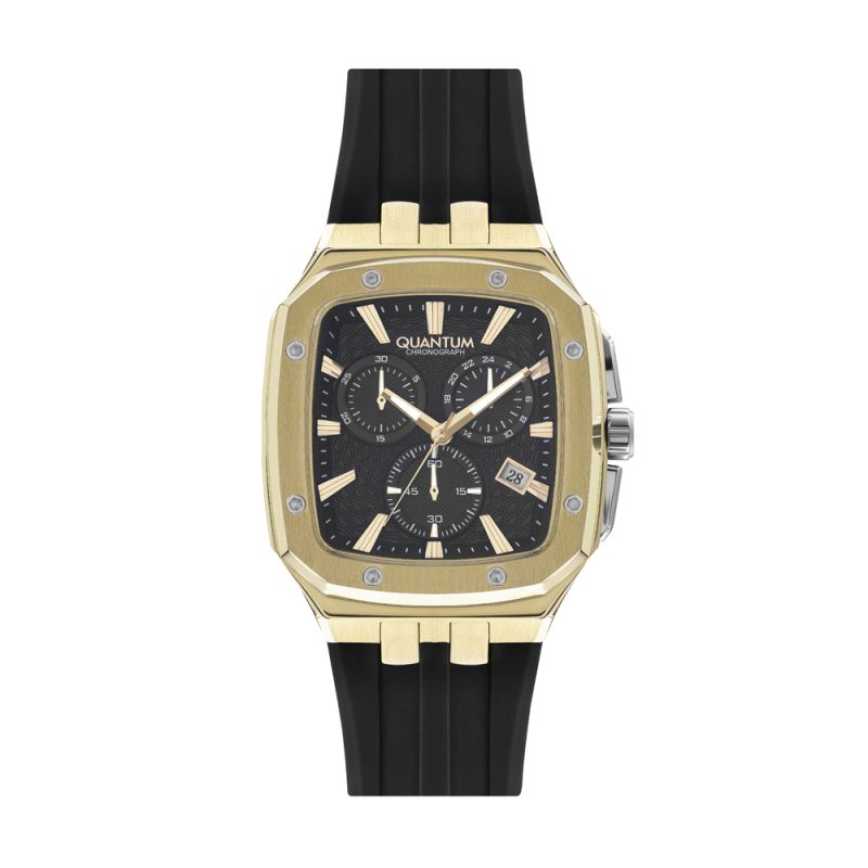 Мъжки часовник Quantum със спортно-ежедневен дизайн от колекцията Hunter. Дисплей хронограф в черен цвят с детайли в цвят злато. Луминесцентно покритие върху стрелките. Стъкло минерал-кристал с антирефлексно покритие. Корпус от неръждаема стомана в комбинация със силиконова каишка. Задвижва се от кварцов механизъм с калибър VR34A. Водоустойчивост 10 ATM - позволява мокрене, къпане и плуване във водни басейни.