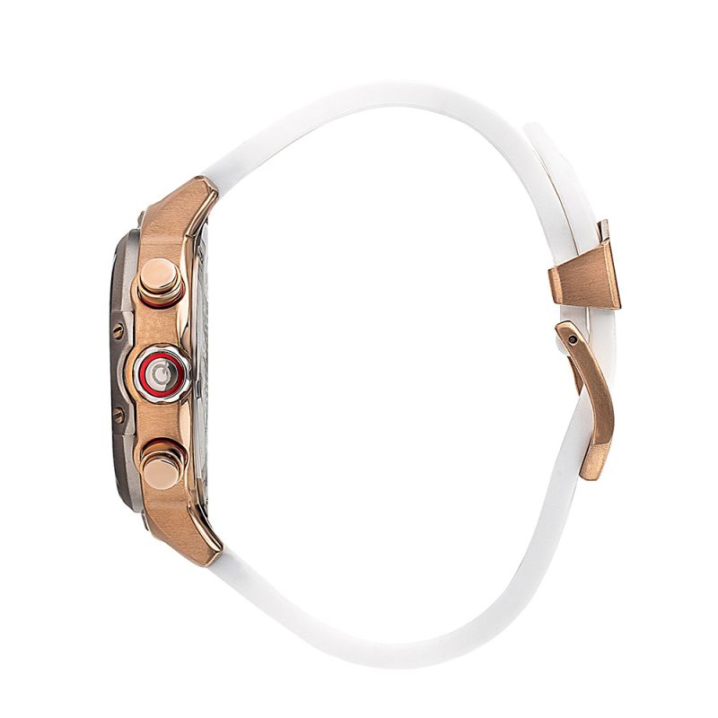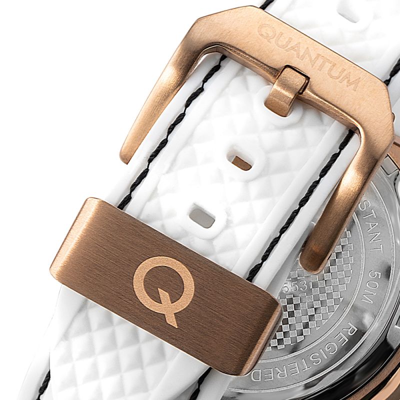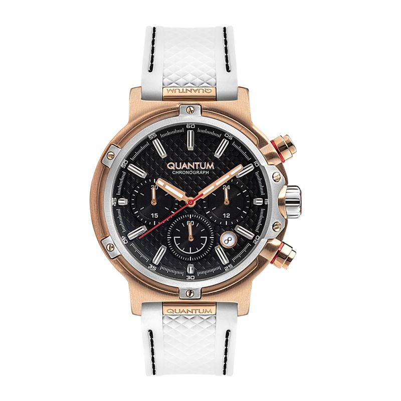 Мъжки часовник Quantum с модерен спортен дизайн. Черен дисплей хронограф с детайли в цвят розово злато. Луминесцентно покритие върху стрелките. Стъкло минерал-кристал с антирефлексно покритие. Корпус от неръждаема стомана. Бяла силиконова каишка с черни шевове. Диаметър на корпуса 46 мм. Задвижва се от кварцов механизъм с калибър VR32. Водоустойчивост 10 ATM - позволява мокрене, къпане и плуване във водни басейни.