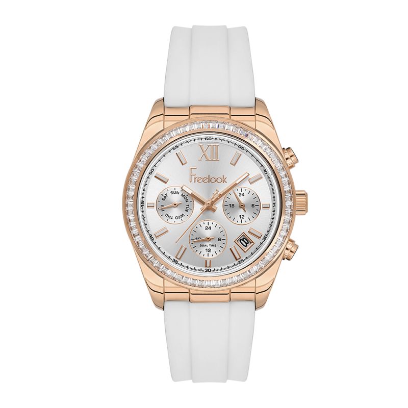 Дамски часовник Freelook със спортно-елегантна визия от колекцията Charmant. Моделът е с мултифункционален дисплей с показатели за дата, ден от седмицата, 24 часов формат и двойно часово време. Декорация от кристали върху безела. Стъкло минерал-кристал. Корпус от неръждаема стомана в комбинация със силиконова каиша. Задвижва се от кварцов механизъм. Водоустойчивост 5 ATM - допускат се леки пръски и взимане на душ, не се препоръчва обилно мокрене.