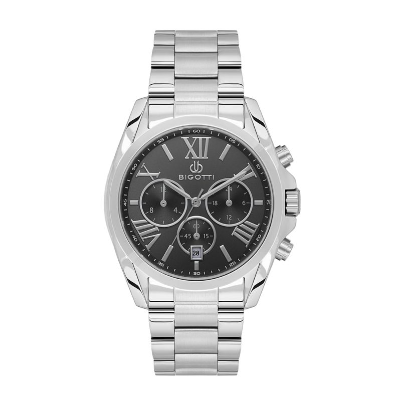 Мъжки часовник Bigotti със спортно-елегантен дизайн от колекцията Raffinato. Черен мултифункционален дисплей със сребристи детайли и римски цифри. Стъкло минерал-кристал. Диаметър на корпуса 42.8 мм. Корпус изработен от месинг. Верижка от неръждаема стомана. Часовникът се задвижва от кварцов механизъм. Водоустойчивост 5 ATM - допускат се леки пръски и взимане на душ, не се препоръчва обилно мокрене.