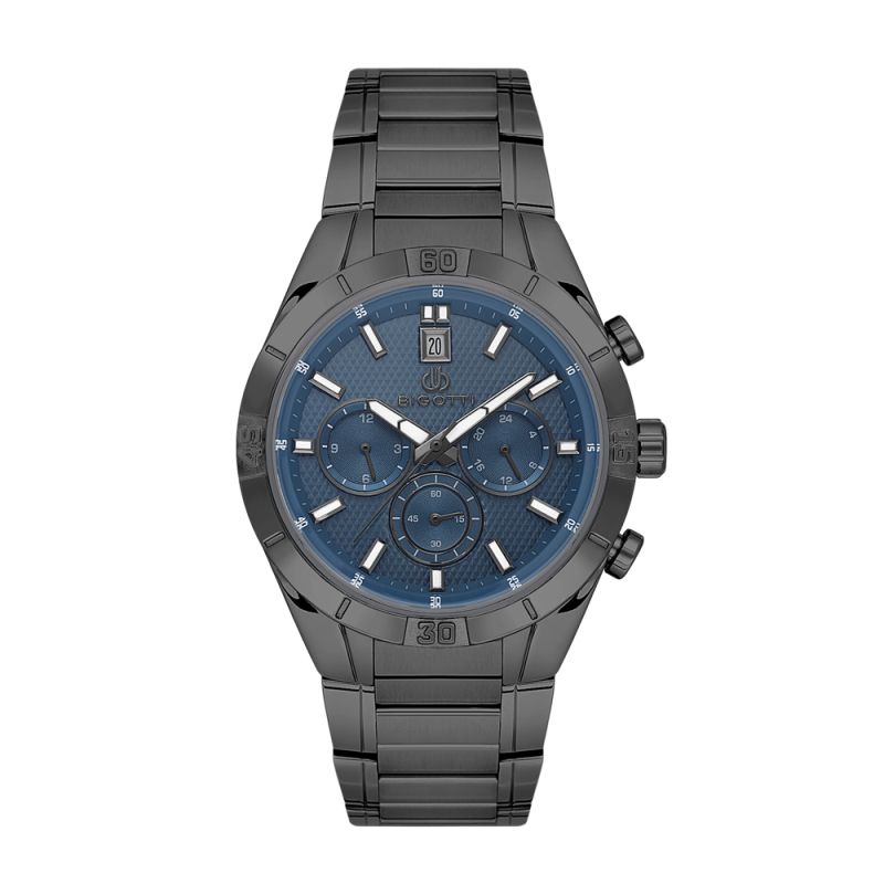 Мъжки часовник Bigotti със спортно-елегантен дизайн от колекцията Raffinato. Тъмносин мултифункционален дисплей с черни детайли. Луминесцентно покритие върху стрелките и индексите. Стъкло минерал-кристал. Диаметър на корпуса 43 мм. Корпус изработен от месинг. Верижка от неръждаема стомана. Часовникът се задвижва от кварцов механизъм. Водоустойчивост 5 ATM - допускат се леки пръски и взимане на душ, не се препоръчва обилно мокрене.