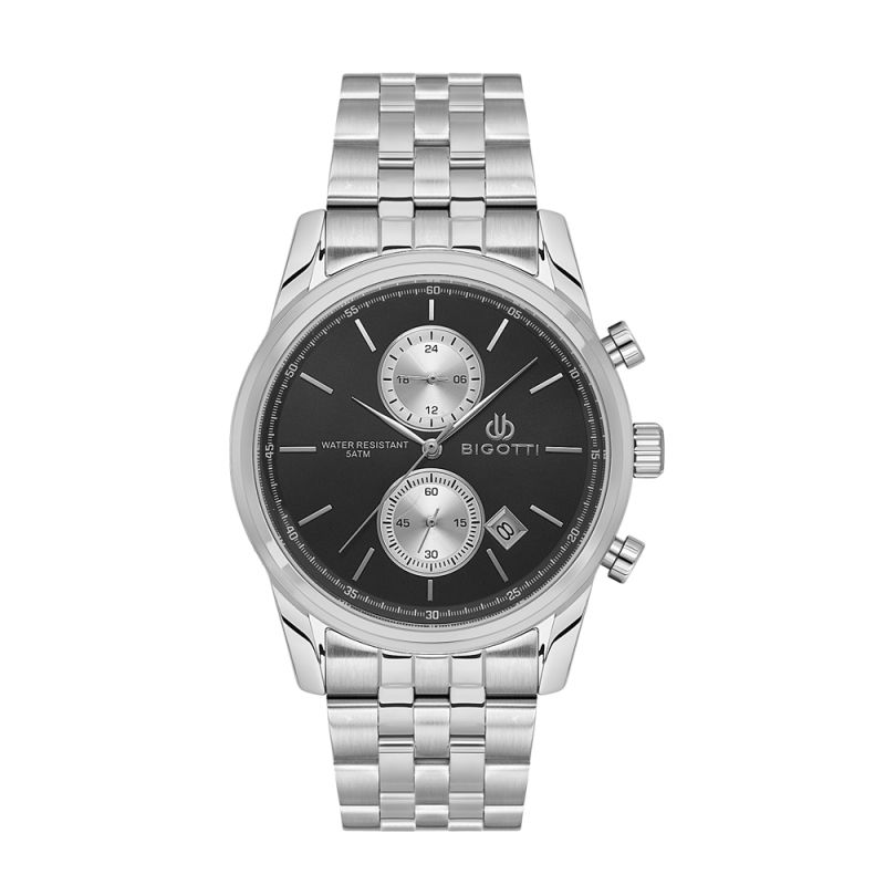Спортно-елегантен мъжки часовник Bigotti с мултифункционален дисплей от колекцията Quotidiano. Моделът е с корпус изработен от месинг и верижка от неръждаема стомана. Стъкло минерал-кристал. Диаметър на корпуса 42 мм. Часовникът се задвижва от кварцов механизъм. Водоустойчивост 5 ATM - допускат се леки пръски и взимане на душ, не се препоръчва обилно мокрене.