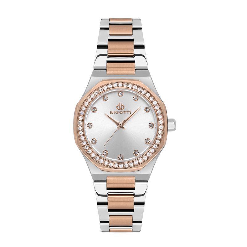 Стилен дамски часовник Bigotti с класически дизайн от колекцията Raffinata. Моделът е с аналогов дисплей и декорация от нежни кристали по индексите и безела. Стъкло минерал-кристал. Корпус от месинг в комбинация с верижка от неръждаема стомана. Диаметър на корпуса 32 мм. Часовникът се задвижва от кварцов механизъм. Водоустойчивост 3 ATM - допускат се леки пръски, не се препоръчва обилно мокрене.