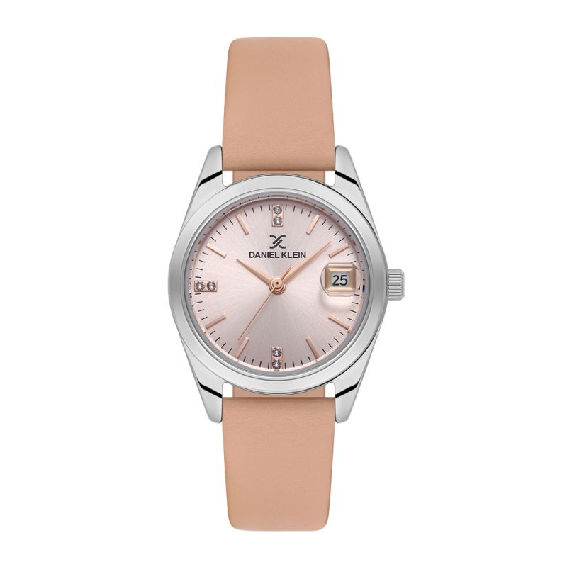 Дамски часовник Daniel Klein с класически дизайн от колекцията Premium. Аналогов дисплей с показател за дата и декорация от нежни кристали върху част от индексите . Стъкло минерал-кристал. Корпус изработен от метал. Розова каишка от естествена кожа. Диаметър на корпуса 28 мм. Задвижва се от кварцов механизъм. Водоустойчивост 3 ATM - допускат се леки пръски, не се препоръчва обилно мокрене.