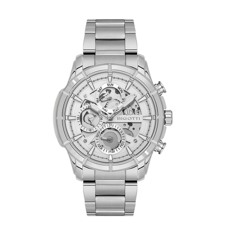 Впечатляващ модел мъжки часовник Bigotti с модерен спортно-елегантен дизайн от колекцията Raffinato. Дисплей комбинация между мултифункционален и скелетон с показатели за дата, ден от седмицата и 24-часов формат. Луминесцентно покритие върху стрелките. Стъкло минерал-кристал. Моделът е с корпус от месинг и верижка от неръждаема стомана. Диаметър на корпуса 44 мм. Часовникът се задвижва от кварцов механизъм. Водоустойчивост 5 ATM - допускат се леки пръски и взимане на душ, не се препоръчва обилно мокрене.