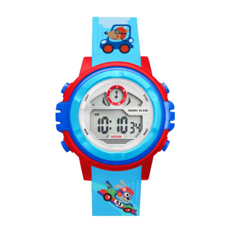 Детски часовник Daniel Klein със забавен дизайн на тема колички. Моделът е с корпус и каишка изработени от полимер. Плексигласово стъкло. Дигитален дисплей. Часовникът има следните функции: показател за дата, ден от седмицата, 12/24 часов форма, аларма и осветяване на дисплея. Задвижва се от кварцов механизъм. Водоустойчивост 5 ATM - допускат се леки пръски и взимане на душ, не се препоръчва обилно мокрене.