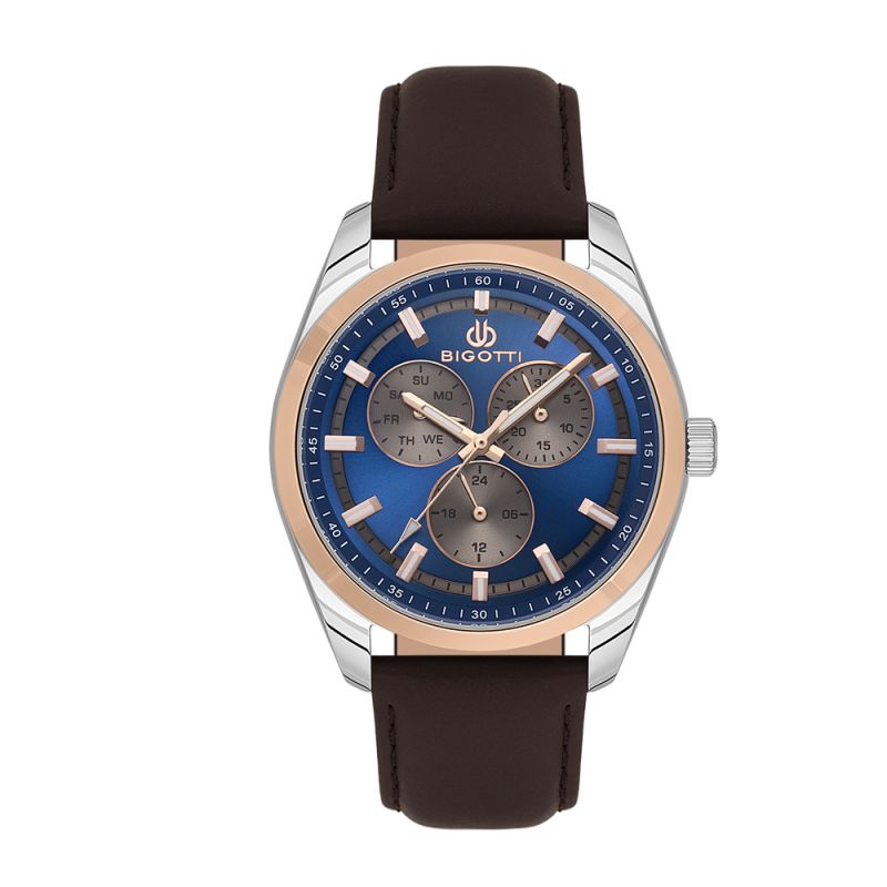 Мъжки часовник Bigotti със спортно-елегантен дизайн от колекцията Quotidiano. Мултифункционален дисплей с показател за ден от седмицата, дата и 24-часов формат. Луминесцентно покритие върху стрелките и индексите. Стъкло минерал-кристал. Моделът е с корпус от месинг и каишка от естествена кожа. Диаметър на корпуса 43 мм. Часовникът се задвижва от кварцов механизъм. Водоустойчивост 5 ATM - допускат се леки пръски и взимане на душ, не се препоръчва обилно мокрене.