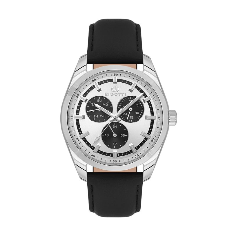 Мъжки часовник Bigotti със спортно-елегантен дизайн от колекцията Quotidiano. Сребрист мултифункционален дисплей с показател за ден от седмицата, дата и 24-часов формат. Луминесцентно покритие върху стрелките и индексите. Стъкло минерал-кристал. Моделът е с корпус от месинг и каишка от естествена кожа. Диаметър на корпуса 43 мм. Часовникът се задвижва от кварцов механизъм. Водоустойчивост 5 ATM - допускат се леки пръски и взимане на душ, не се препоръчва обилно мокрене.
