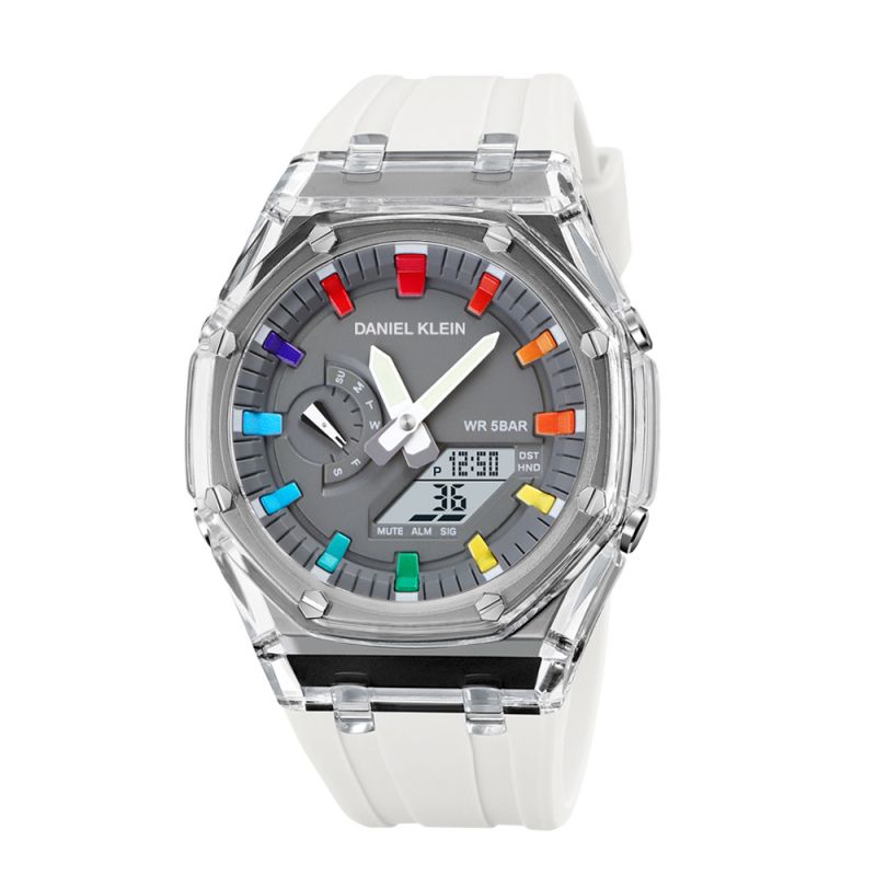 Мъжки часовник Daniel Klein със спортен дизайн от колекцията Digital. Дисплей комбинация от аналогов и дигитален в сив цвят с цветни детайли. Плексигласово стъкло. Корпус изработен от полимер. Бяла силиконова каишка. Часовникът има следните функции: показател за дата, ден от седмицата, 12/24 часов формат и аларма. Задвижва се от кварцов механизъм. Водоустойчивост 5 ATM - допускат се леки пръски и взимане на душ, не се препоръчва обилно мокрене.
