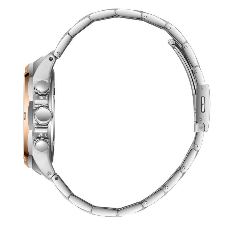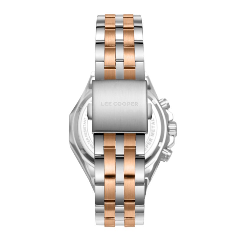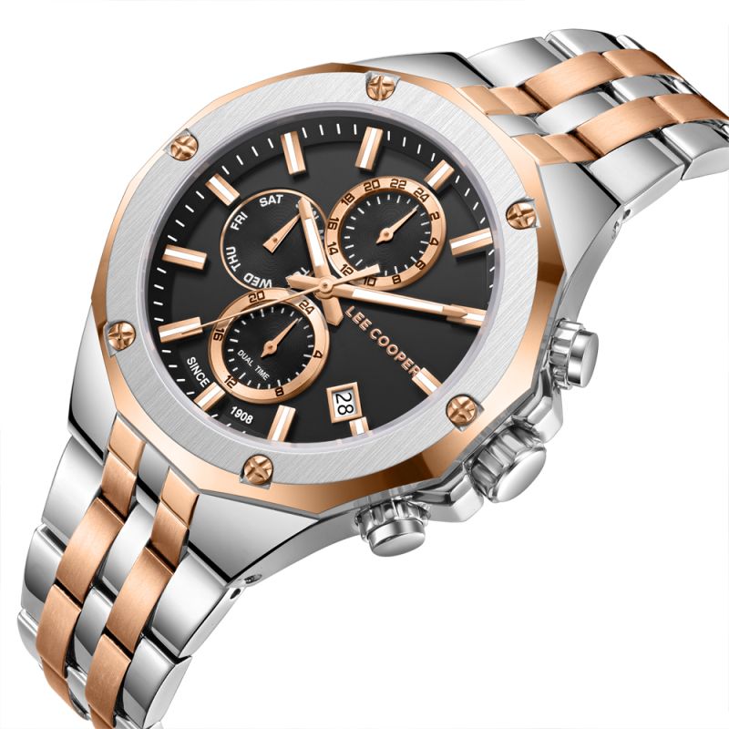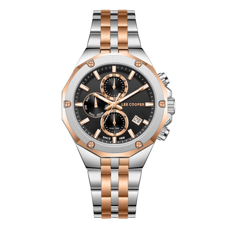 Спортно-елегантен мъжки часовник Lee Cooper от колекцията Classic Multifunction. Черен мултифункционален дисплей с детайли в цвят розово злато. Луминесцентно покритие върху стрелките и индексите. Стъкло минерал-кристал. Корпус изработен от супер метал - специална сплав, създадена от марката. Диаметър на корпуса 42 мм. Верижка от неръждаема стомана. Задвижва се от кварцов механизъм. Водоустойчивост 3 ATM - допускат се леки пръски, не се препоръчва обилно мокрене.