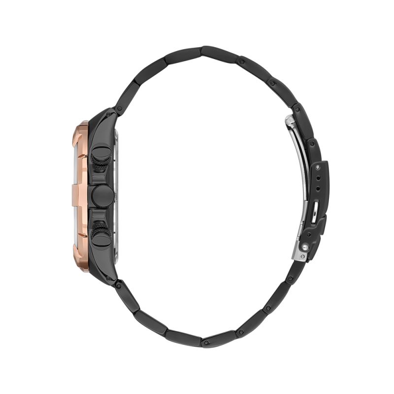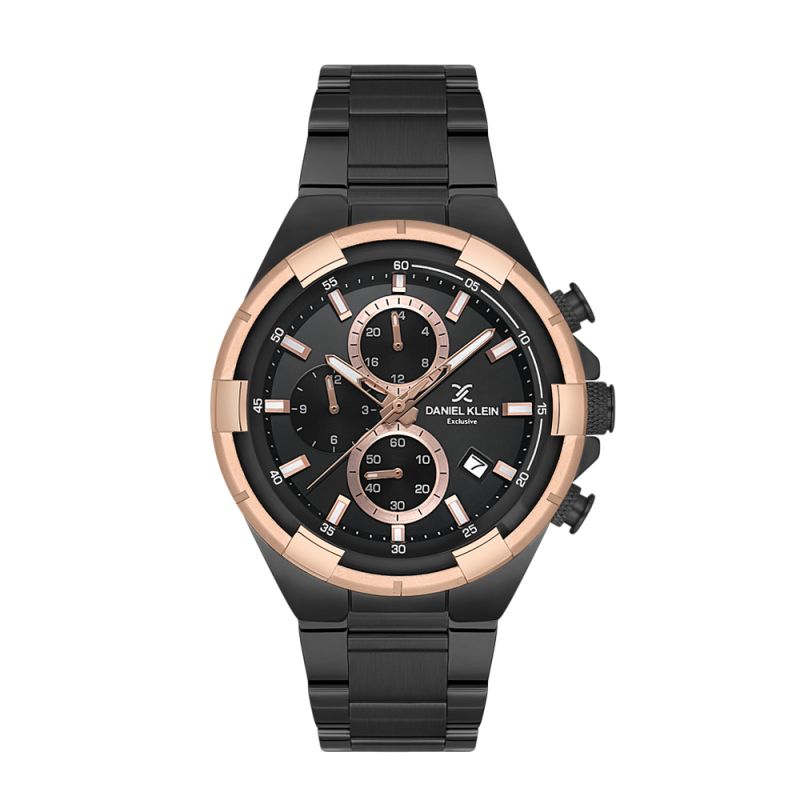 Модерен мъжки часовник Daniel Klein със спортно-ежедневен дизайн от колекцията Exclusive. Черен мултифункционален дисплей с детайли в цвят розово злато. Луминесцентно покритие върху стрелките и индексите. Стъкло минерал-кристал. Корпус изработен от метал. Верижка от неръждаема стомана. Диаметър на корпуса 44 мм. Часовникът се задвижва от кварцов механизъм. Водоустойчивост 5 ATM - допускат се леки пръски и взимане на душ, не се препоръчва обилно мокрене.