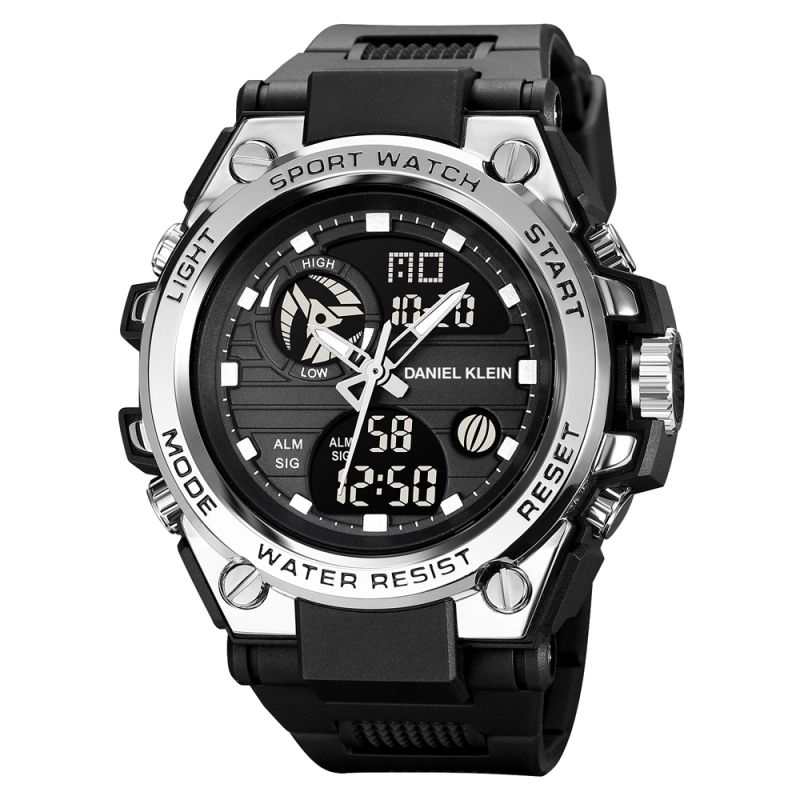 Мъжки часовник Daniel Klein със спортен дизайн от колекцията Digital. Дисплей комбинация от аналогов и дигитален. Плексигласово стъкло. Корпус изработен от полимер и метал. Черна каишка от полимер. Часовникът има следните функции: показател за дата и ден от седмицата, 12/24 часов формат, аларма и осветяване на дисплея. Задвижва се от кварцов механизъм. Водоустойчивост 5 ATM - допускат се леки пръски и взимане на душ, не се препоръчва обилно мокрене.