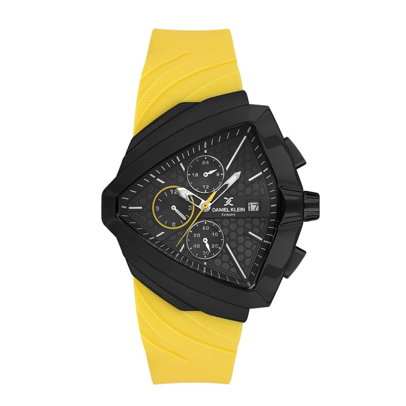 Впечатляващ мъжки часовник Daniel Klein с модерен дизайн от колекцията Exclusive. Мултифункционален дисплей с интересна триъгълна форма. Стъкло минерал-кристал. Моделът е с метален корпус. Жълта силиконова каишка. Задвижва се от кварцов механизъм. Водоустойчивост 5 ATM - допускат се леки пръски и взимане на душ, не се препоръчва обилно мокрене.
