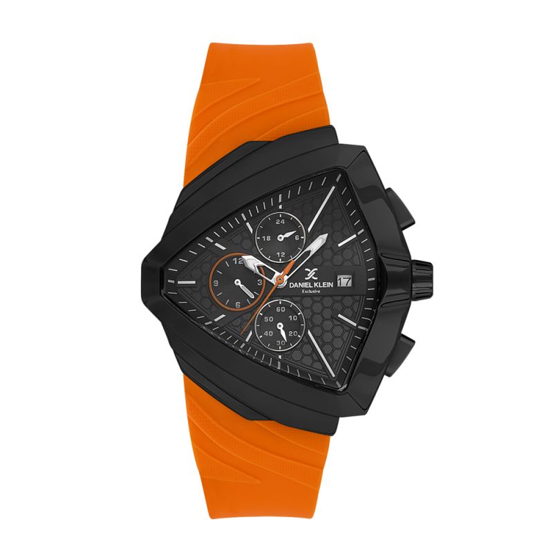 Впечатляващ мъжки часовник Daniel Klein с модерен дизайн от колекцията Exclusive. Мултифункционален дисплей с интересна триъгълна форма. Стъкло минерал-кристал. Моделът е с метален корпус. Оранжева силиконова каишка. Задвижва се от кварцов механизъм. Водоустойчивост 5 ATM - допускат се леки пръски и взимане на душ, не се препоръчва обилно мокрене.