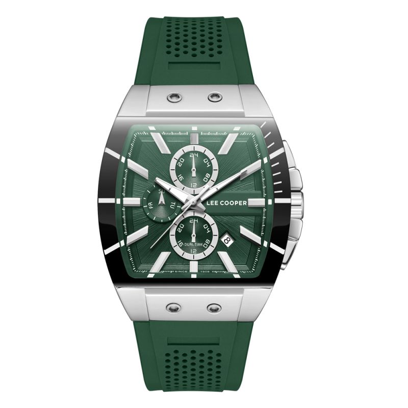 Мъжки часовник Lee Cooper със спорен дизайн от колекцията Classic Dual Time. Корпус изработен от супер метал - специална сплав, създадена от марката. Силиконова каишка. Тъмнозелен мултифункционален дисплей с показатели за ден, дата и двойно време. Стъкло минерал-кристал. Задвижва се от кварцов механизъм. Водоустойчивост 5 ATM - допускат се леки пръски и взимане на душ, не се препоръчва обилно мокрене.
