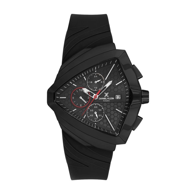 Впечатляващ мъжки часовник Daniel Klein с модерен дизайн от колекцията Exclusive. Мултифункционален дисплей с интересна триъгълна форма. Стъкло минерал-кристал. Моделът е с метален корпус. Черна силиконова каишка. Задвижва се от кварцов механизъм. Водоустойчивост 5 ATM - допускат се леки пръски и взимане на душ, не се препоръчва обилно мокрене.
