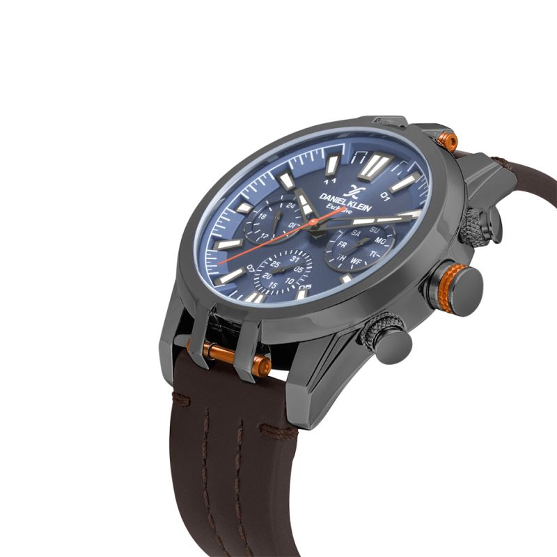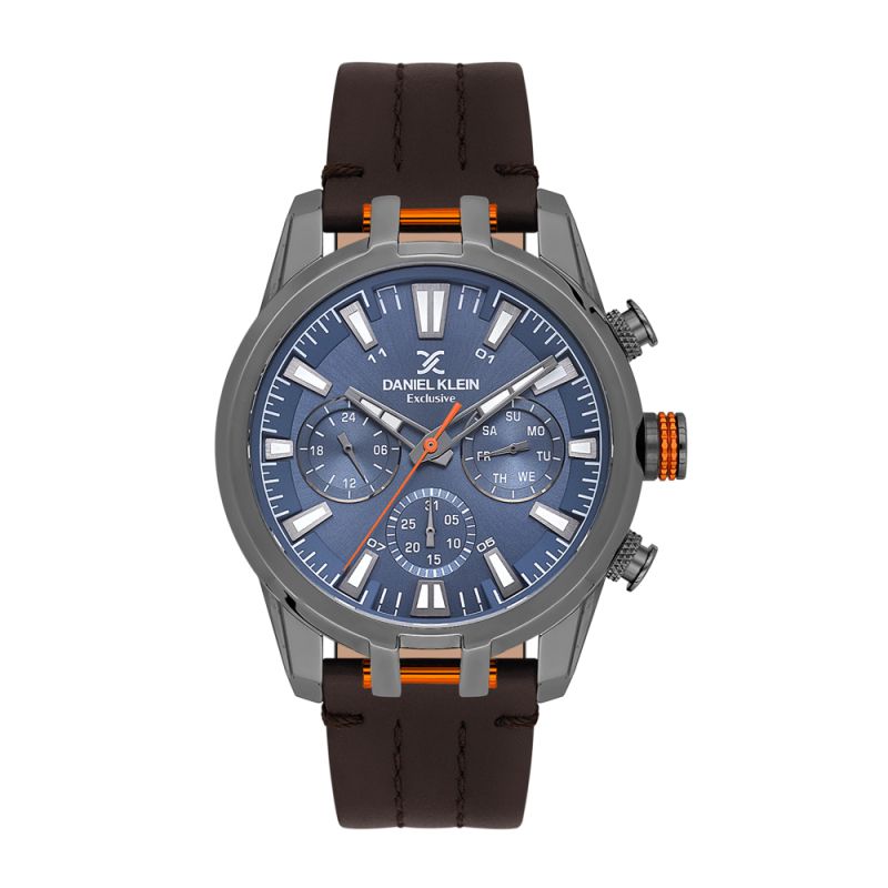 Спортно-елегантен мъжки часовник Daniel Klein от колекцията Exclusive. Стилен мултифункционален дисплей с показатели за дата, ден от седмицата и 24-часов формат. Луминесцентно покритие върху стрелките и индексите. Стъкло минерал-кристал. Корпус изработен от метал. Каишка от естествена кожа в тъмнокафяв цвят. Диаметър на корпуса 44 мм. Часовникът се задвижва от кварцов механизъм. Водоустойчивост 5 ATM - допускат се леки пръски и взимане на душ, не се препоръчва обилно мокрене.