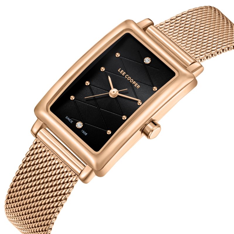 Красив дамски часовник Lee Cooper със стилен дизайн от колекцията Elegance. Корпус изработен от супер метал - специална сплав, създадена от марката. Меш верижка от неръждаема стомана. Черен аналогов дисплей, декориран с два нежни кристала и акценти в цвят розово злато. Стъкло минерал-кристал. Задвижва се от кварцов механизъм. Водоустойчивост 3 ATM - допускат се леки пръски, не се препоръчва обилно мокрене.