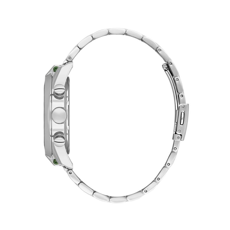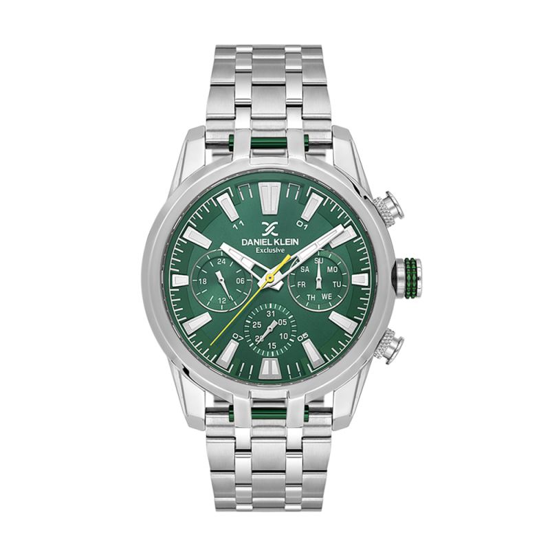 Мъжки часовник Daniel Klein със спортно-елегантен дизайн от колекцията Exclusive. Мултифункционален дисплей в зелен цвят с показатели за дата, ден от седмицата и 24-часов формат. Луминесцентно покритие върху стрелките и индексите. Стъкло минерал-кристал. Метален корпус съчетан с верижка от неръждаема стомана. Диаметър на корпуса 44 мм. Часовникът се задвижва от кварцов механизъм. Водоустойчивост 5 ATM - допускат се леки пръски и взимане на душ, не се препоръчва обилно мокрене.