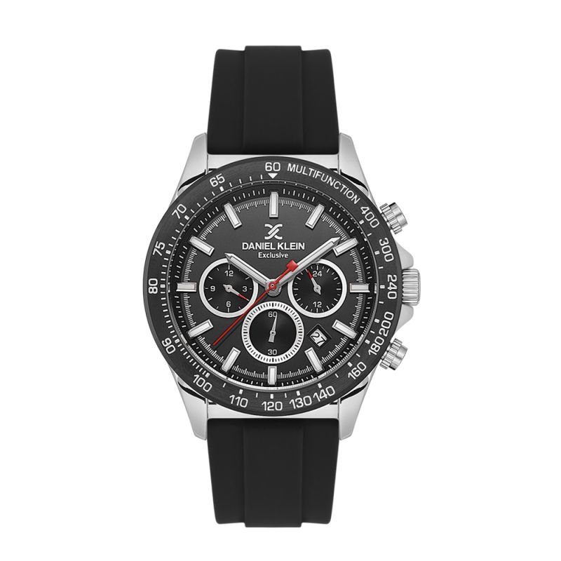 Мъжки часовник Daniel Klein със спортен дизайн от колекцията Exclusive. Тъмносив мултифункционален дисплей със сребристи детайли. Луминесцентно покритие върху стрелките и индексите. Стъкло минерал-кристал. Диаметър на корпуса 44 мм. Часовникът е с метален корпус и силиконова каишка. Задвижва се от кварцов механизъм. Водоустойчивост 5 ATM - допускат се леки пръски и взимане на душ, не се препоръчва обилно мокрене.