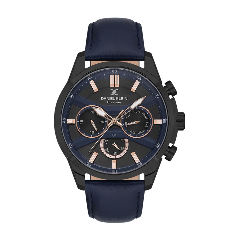 Мъжки часовник Daniel Klein със спортно-елегантен дизайн от колекцията Exclusive. Корпус изработен от метал. Каишка от естствена кожа в тъмносин цвят. Мултифункционален дисплей с показатели за дата, ден от седмицата и 24-часов формат. Луминесцентно покритие върху стрелките и индексите. Стъкло минерал-кристал. Диаметър на корпуса 44 мм. Часовникът се задвижва от кварцов механизъм. Водоустойчивост 5 ATM - допускат се леки пръски и взимане на душ, не се препоръчва обилно мокрене.