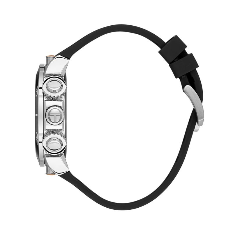 Мъжки часовник Sergio Tacchini с модерна спортна визия от колекцията Heritech. Корпус от неръждаема стомана съчетан със силиконова каишка. Мултифункционален дисплей с интересен дизайн. Луминесцентно покритие върху стрелките и индексите. Стъкло минерал-кристал. Диаметър на корпуса 47 мм. Часовникът се задвижва от кварцов механизъм. Водоустойчивост 10 ATM - позволява мокрене, къпане и плуване във водни басейни.