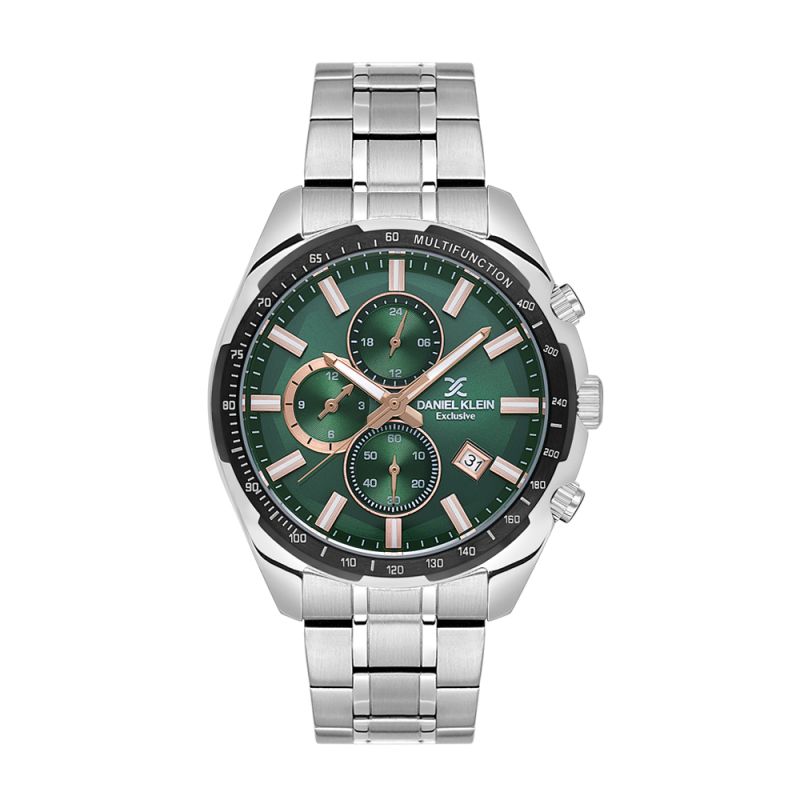 Мъжки часовник Daniel Klein със спортно-ежедневен дизайн от колекцията Exclusive. Мултифункционален дисплей в тъмнозелен цвят. Луминесцентно покритие върху стрелките и индексите. Стъкло минерал-кристал. Часовникът е с метален корпус и верижка от неръждаема стомана. Здвижва се от кварцов механизъм. Водоустойчивост 5 ATM - допускат се леки пръски и взимане на душ, не се препоръчва обилно мокрене.