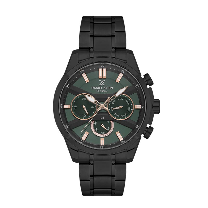 Спортно-елегантен мъжки часовник Daniel Klein от колекцията Exclusive. Моделът е с метален корпус и верижка от неръждаема стомана. Мултифункционален дисплей в тъмнозелен цвят с показатели за дата, ден от седмицата и 24-часов формат. Луминесцентно покритие върху стрелките и индексите. Стъкло минерал-кристал. Диаметър на корпуса 44 мм. Часовникът се задвижва от кварцов механизъм. Водоустойчивост 5 ATM - допускат се леки пръски и взимане на душ, не се препоръчва обилно мокрене.