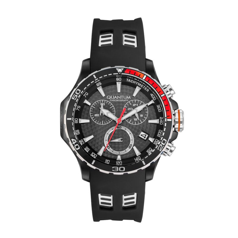 Мъжки часовник Quantum със спортен дизайн от колекцията Hunter. Черен дисплей хронограф със сребристи детайли. Луминесцентно покритие върху стрелките и индексите. Стъкло минерал-кристал с антирефлексно покритие. Корпус изработен от неръждаема стомана. Черна силиконова каишка със сребристи акценти. Часовникът се задвижва от кварцов механизъм с калибър VR34A. Водоустойчивост 10 ATM - позволява мокрене, къпане и плуване във водни басейни.