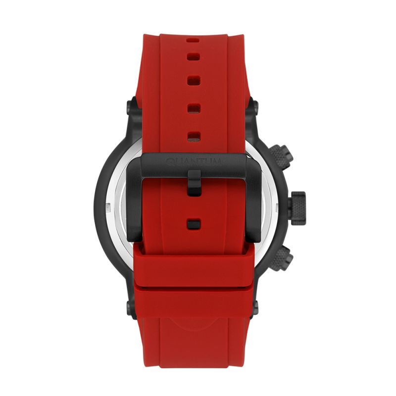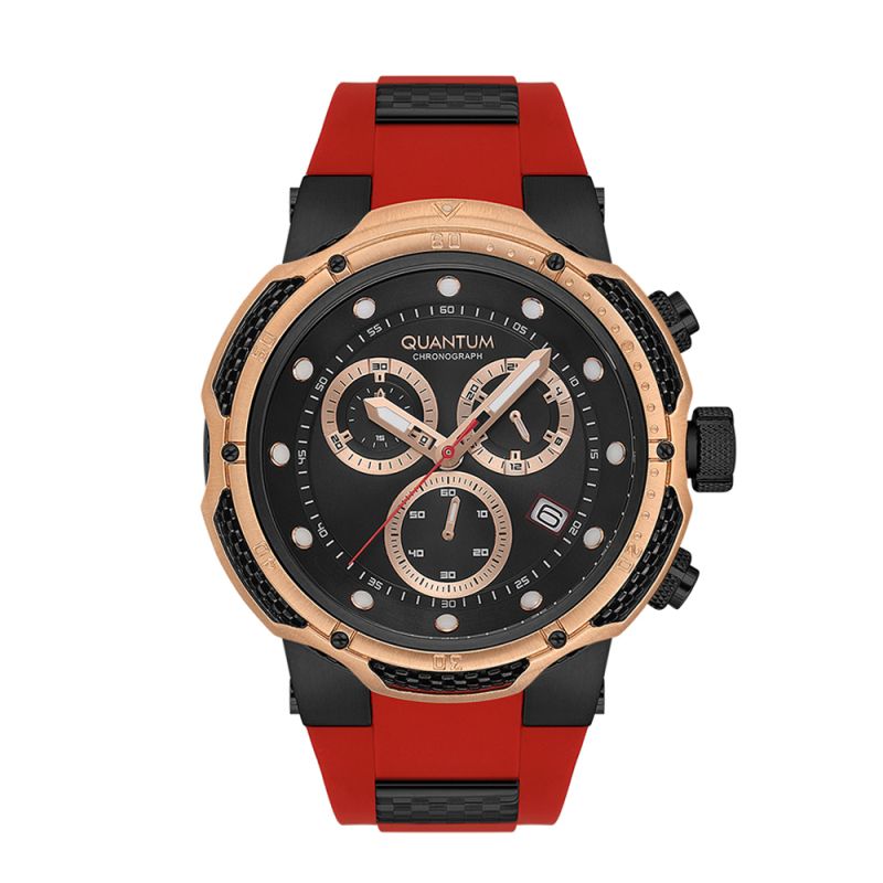 Мъжки часовник Quantum от колекцията Hunter. Черен дисплей хронограф с детайли в цвят розово злато. Луминесцентно покритие върху стрелките и индексите. Стъкло минерал-кристал с антирефлексно покритие. Корпус изработен от неръждаема стомана. Червена силиконова каишка с черни акценти. Часовникът се задвижва от кварцов механизъм с калибър VR34. Водоустойчивост 10 ATM - позволява мокрене, къпане и плуване във водни басейни.