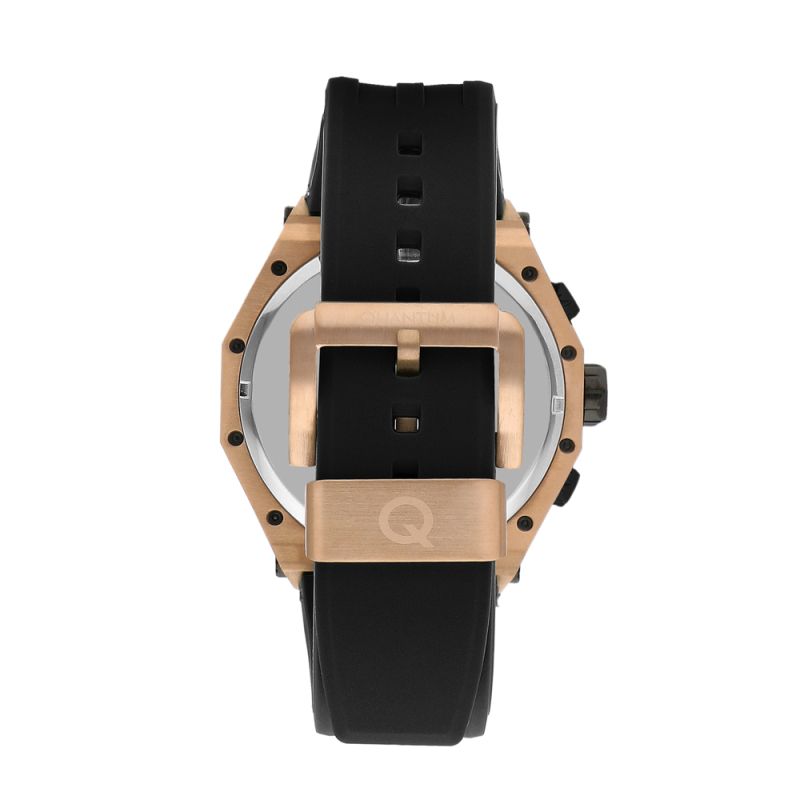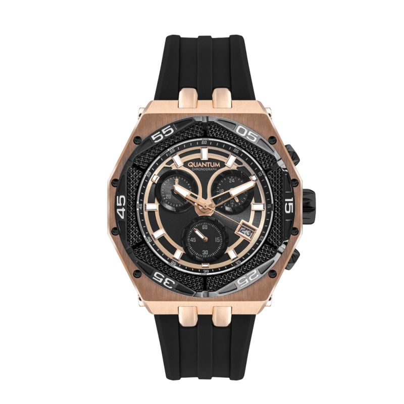 Мъжки часовник Quantum с интересен и модерен спортно-ежедневен дизайн от колекцията Hunter. Дисплей тип хронограф в черен цвят с детайли в цвят розово злато. Луминесцентно покритие върху стрелките и индексите. Стъкло минерал-кристал с антирефлексно покритие. Корпус от неръждаема стомана. Черна силиконова каишка. Задвижва се от кварцов механизъм с калибър VR34B14. Диаметър на корпуса 50 мм. Водоустойчивост 10 ATM - позволява мокрене, къпане и плуване във водни басейни.