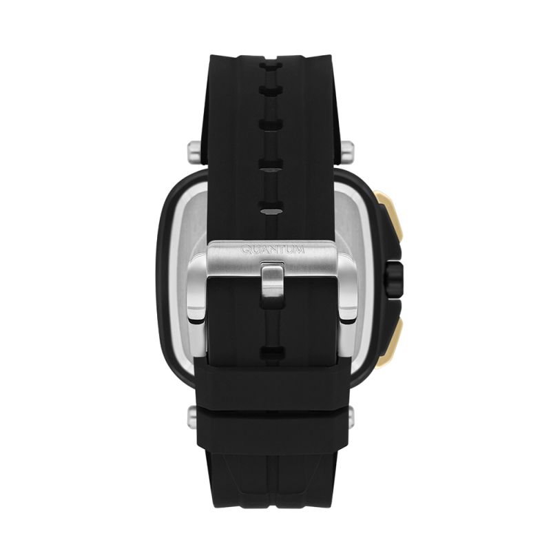 Мъжки часовник Quantum със спортно-ежедневен дизайн от колекцията Powertech. Мултифункционален дисплей в черен цвят със златисти детайли. Луминесцентно покритие на стрелките и индексите. Стъкло минерал-кристал с антирефлексно покритие. Корпус от неръждаема стомана. Черна силиконова каишка. Задвижва се от кварцов механизъм с калибър VX9NE. Водоустойчивост 10 ATM - позволява мокрене, къпане и плуване във водни басейни.