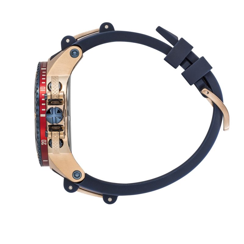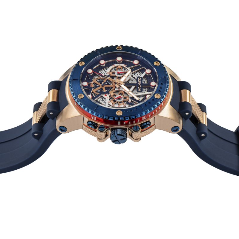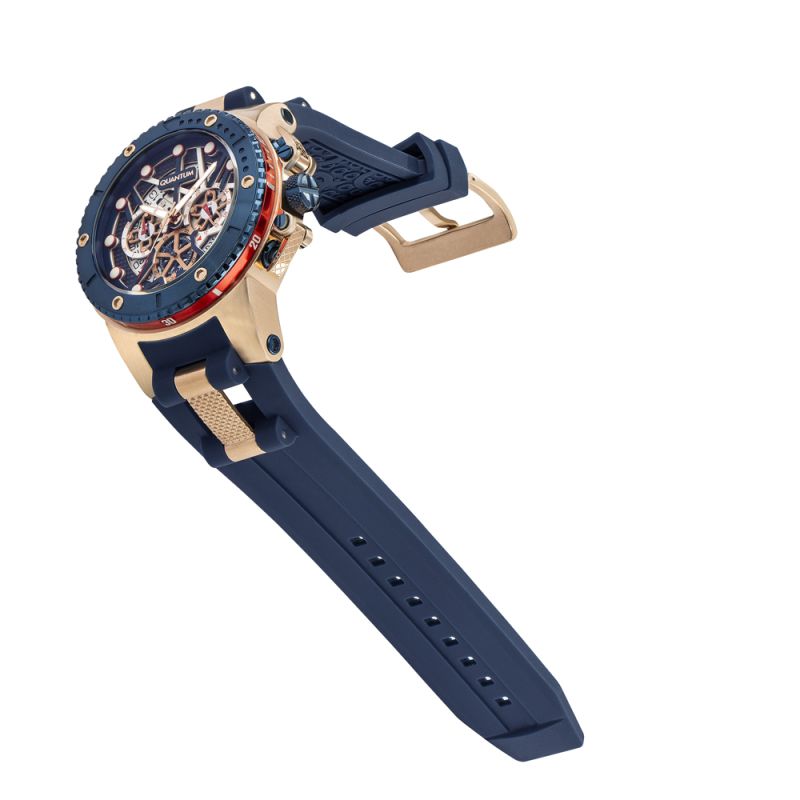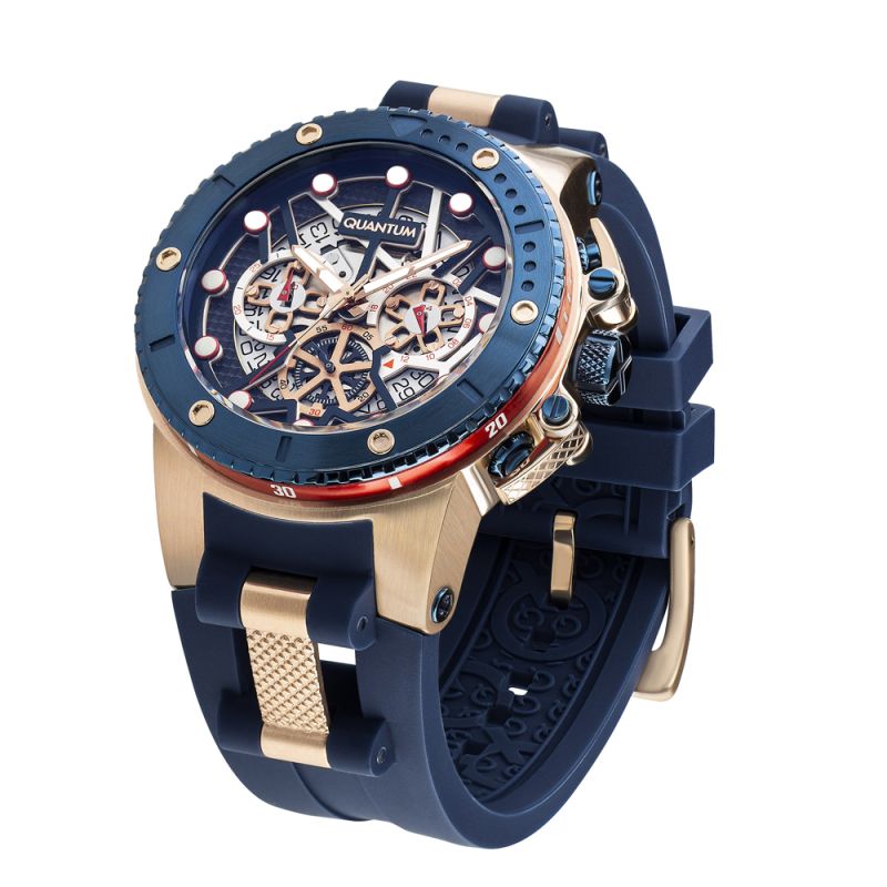 Страхотен модел мъжки часовник Quantum от колекцията Hunter. Дисплей комбинация от хронограф и скелетон с впечатляващ дизайн. Луминесцентно покритие върху стрелките и индексите. Стъкло минерал-кристал с антирефлексно покритие. Корпус изработен от неръждаема стомана. Тъмносиня силиконова каишка с детайли в цвят розово злато. Диаметър на корпуса 50 мм. Часовникът се задвижва от кварцов механизъм. Водоустойчивост 10 ATM - позволява мокрене, къпане и плуване във водни басейни.