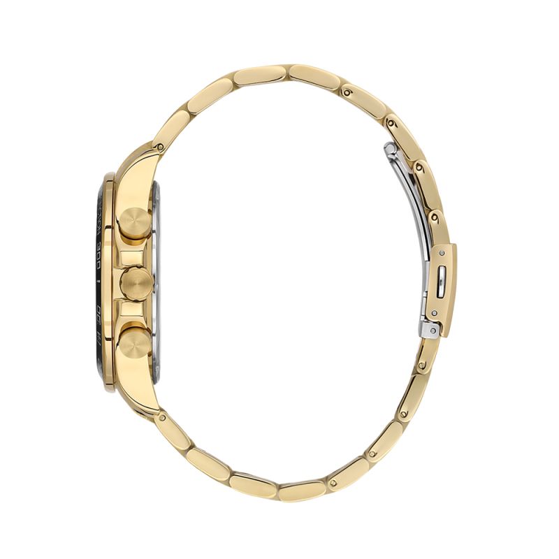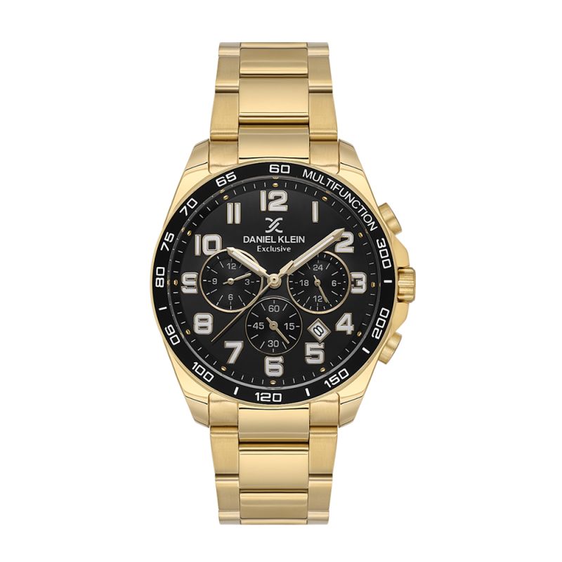 Страхотен модел мъжки часовник Daniel Klein със спортно-ежедневен дизайн от колекцията Exclusive. Черен милтифункционален дисплей с детайли в цвят злато. Луминесцентно покритие върху стрелките и цифрите. Стъкло минерал-кристал. Диаметър на корпуса 43 мм. Метален корпус съчетан с верижка от неръждаема стомана. Часовникът се задвижва от кварцов механизъм. Водоустойчивост 5 ATM - допускат се леки пръски и взимане на душ, не се препоръчва обилно мокрене.