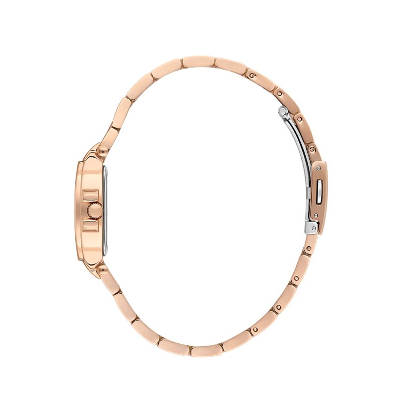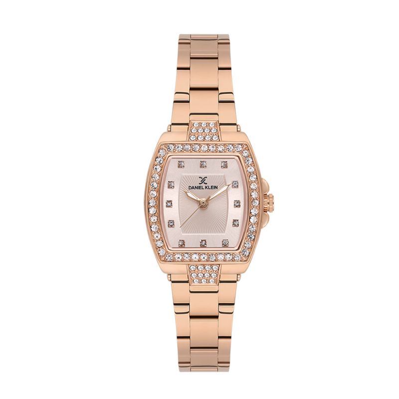 Изящен дамски часовник Daniel Klein със стилна визия от колекцията Premium. Аналогов дисплей в цвят розово злато със семпъл дизайн. Декорация от нежни кристали по индексите, безела и част от верижката. Стъкло минерал-кристал. Корпус изработен от метал. Верижка от неръждаема стомана. Часовникът се задвижва от кварцов механизъм. Водоустойчивост 3 ATM - допускат се леки пръски, не се препоръчва обилно мокрене.