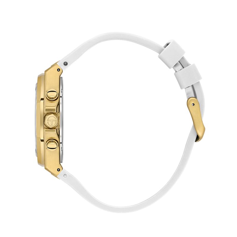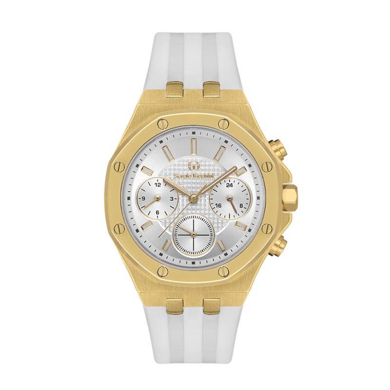 Страхотен модел дамски часовник Sergio Tacchini със спортен дизайн от колекцията Coastlife. Сребрист мултифункционален дисплей с детайли в цвят злато. Стъкло минерал-кристал. Корпус изработен от неръждаема стомана. Бяла силиконова каишка. Диаметър на корпуса 37 мм. Задвижва се от кварцов механизъм. Водоустойчивост 5 ATM - допускат се леки пръски и взимане на душ, не се препоръчва обилно мокрене.