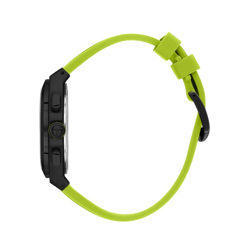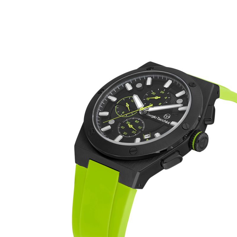 Мъжки часовник Sergio Tacchini със спортно-ежедневен дизайн от колекцията Archivio. Моделът е с мултифункционален дисплей и стъкло минерал-кристал. Корпус изработен от неръждаема стомана. Светлозелена силиконова каишка. Диаметър на корпуса 44 мм. Задвижва се от кварцов механизъм. Водоустойчивост 5 ATM - допускат се леки пръски и взимане на душ, не се препоръчва обилно мокрене.