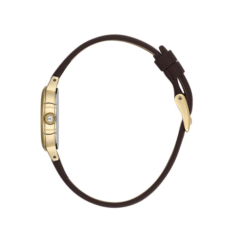Дамски часовник Daniel Klein със стилен дизайн от колекцията Premium. Седефен аналогов дисплей със стрелки и индекси в цвят злато. Стъкло минерал-кристал. Корпус изработен от метал. Тъмнокафява каишка от естествена кожа. Диаметър на корпуса 26 мм. Часовникът се задвижва от кварцов механизъм. Водоустойчивост 3 ATM - допускат се леки пръски, не се препоръчва обилно мокрене.